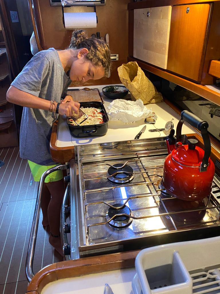 … et la tempête a commencé!! Pendant la nuit papa s’est levé pour doubler les amarres et ranger tout ce qui traînait dehors. ça soufflait par rafales super fortes et il pleuvait des trombes 💨🌧⛈⚡️⚡️⚡️ Il y avait des éclairs tout le temps, c’était comme le jour pendant la nuit… A un moment il y a eu une rafale tellement forte que le bateau s’est couché, plein de choses sont tombées dans le bateau… Papa est sorti et le bimini (le toit pare-soleil) s’est arraché… le dinghi s’est retourné… la nourrice flottait à côté et le moteur était à l’envers dans l’eau… la caisse à fleurs s’est envolée…! On a eu très peur qu’il y en ait d’autres encore plus fortes alors on a mis nos gilets de sauvetage et nos chaussures au cas où il fallait quitter le bateau… 😰 Heureusement ça s’est un peu calmé ensuite et on a pu retourner au lit… tous les 4 les uns contre les autres dans le lit de papa et maman pour ne pas avoir peur.