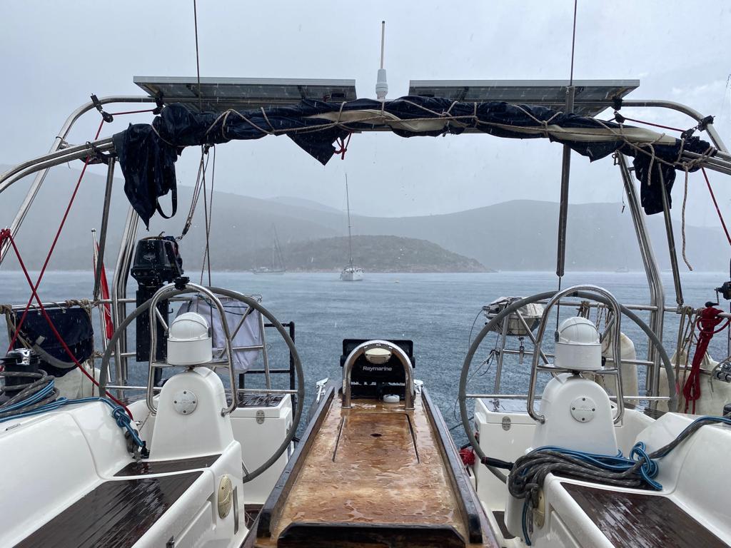 Nous avons pu repartir en début d’après-midi quand le vent a commencé à baisser. Nous avons navigué au près jusqu’à Porto Petro. Jolie navigation mais pas de tout repos avec les virements de bord et les grosses vagues. Les autres voiliers qui allaient dans la même direction que nous avançaient au moteur… mais pas tellement plus vite et ils se faisaient brasser encore plus que nous! 🤣