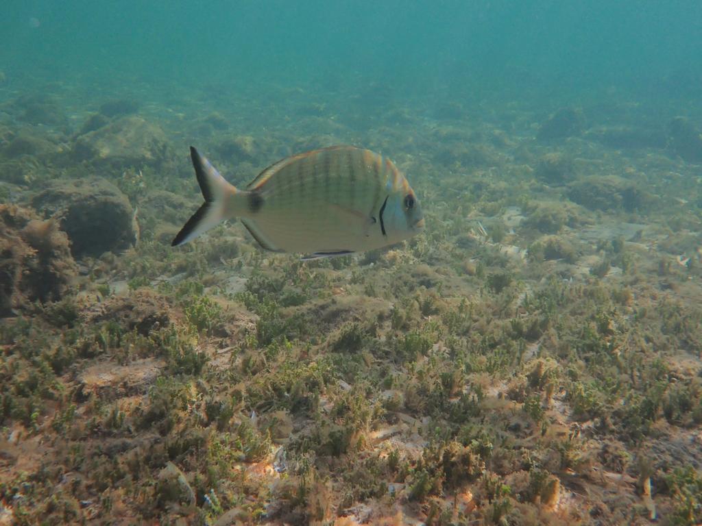 L’après-midi nous avons pris le dinghi pour aller voir une grande grotte bleue sur la côte nord de l’île. La pluie a commencé à tomber et la houle était assez forte. Nous sommes entrés dans la grotte avec le dinghi pour nous mettre à l’abri mais nous n’avons pas osé faire du snorkeling à l’intérieur parce que nous n’avions pas envie de nous faire écraser contre les rochers avec la houle 🌊 De retour dans la baie, nous avons fait du snorkeling jusqu’à la seule plage où il est permis de se baigner. Il y avait des panneaux explicatifs sur les poissons sous l’eau, c’était marrant! 🐠🐟🐡🦐🐙