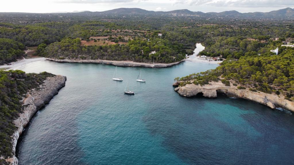 Nous sommes partis en direction du sud pour nous rapprocher de l’archipel de Cabrera où nous avions réservé une bouée pour la nuit de vendredi avant de traverser vers Ibiza. Après avoir hésité entre quelques criques, nous avons jeté l’ancre à la Cala Mondrago. Cet endroit magnifique est bondé la journée avec des bidochons partout et des bateaux « glass-bottom boat dolphin trip » avec leurs toboggans et la musique trop fort… et le soir il se transforme en petit paradis où nous avons passé la nuit avec 3 autres voiliers. Tanguy a pu piloter le drone pour prendre quelques photos vue du ciel.
