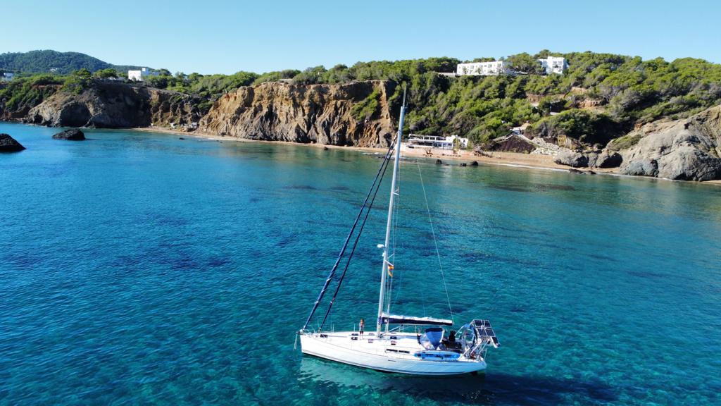 Vendredi nous sommes arrivés à Cabrera à l’heure du dîner. ça soufflait fort et la prévision annonçait du vent jusqu’au milieu de la nuit, puis plus rien du tout pendant plusieurs jours. Nous avons voté l’option de partir le jour-même pour Ibiza afin d’utiliser les airs et éviter de devoir faire trop longtemps du moteur. Durant la navigation nous avons eu deux petits orages qui on bien rincé le bateau sans nous causer de problème technique ni quoi que se soit. Arrivés à Ibiza, nous avons mis l’ancre à côté de la marina de Santa Eulalia pour faire le petit déjeuner. Nous sommes ensuite allés en direction de Aguas Blancas pour le dîner et la nuit. Là-bas on s’est baignés dans une eau très claire et peu profonde. Des hippies cul-nus ont mis l’ambiance pendant la soirée avec leurs chants et leurs tamtams… on est bien sur l’île des teufs et des hippies ☮️ 🥳!
