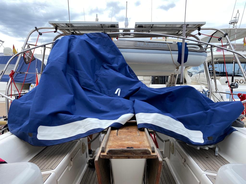 On a aussi pu résoudre notre problème de bimini tout déchiré. Papa a demandé à une voilerie de nous en refaire un tout neuf sur mesure parce que l’ancien n’était pas réparable, la toile était complètement cuite. Les gars sont venus prendre les mesures le mardi matin et jeudi le nouveau bimini était déjà installé!