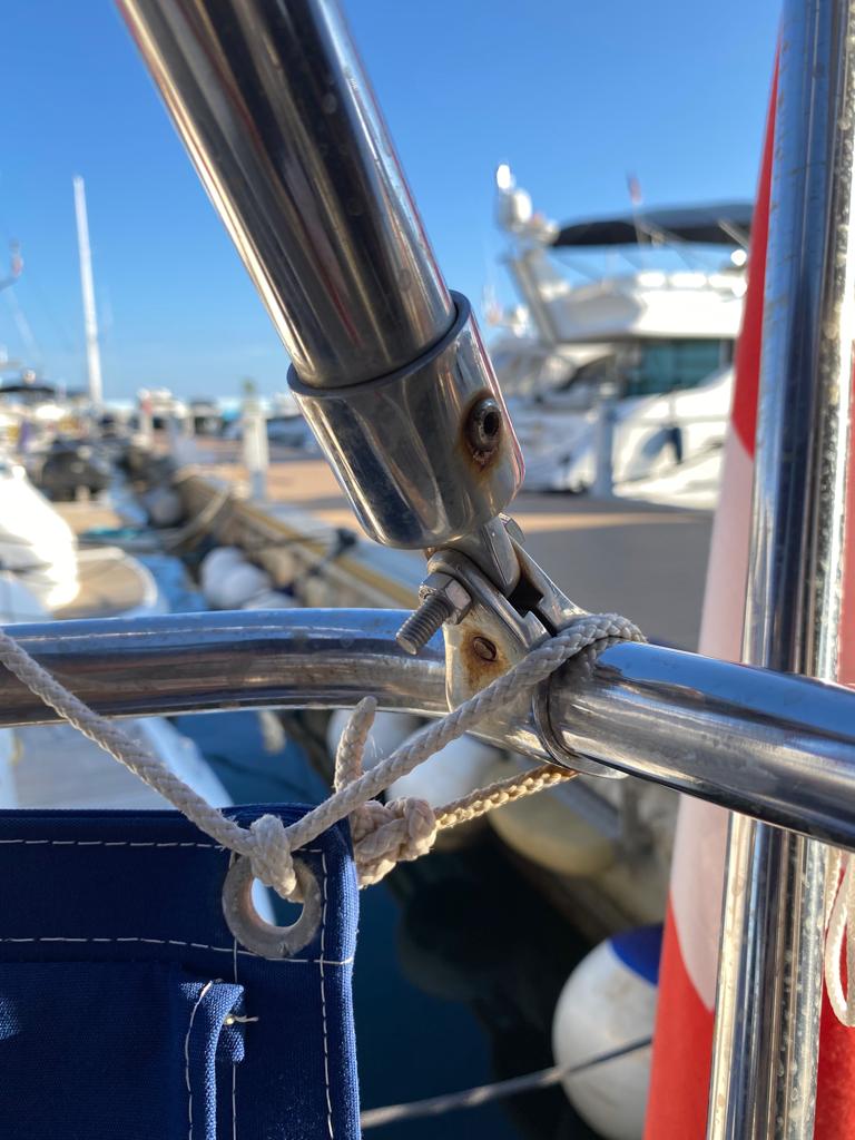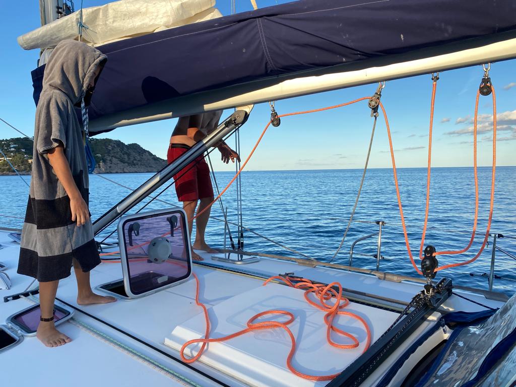 On en a aussi profité pour tuner notre yacht : on a changé l’écoute de grand voile, changé le boute de l’enrouleur de génois, ajouté des couleurs sur la chaîne de l’ancre et Tanguy a fabriqué lui tout seul un hamac à fruits 🥝🍎🥑🍐🍌🍋. Ce hamac permet de conserver les fruits à l’air et sans qu’ils se tapent ou tombent quand on navigue.