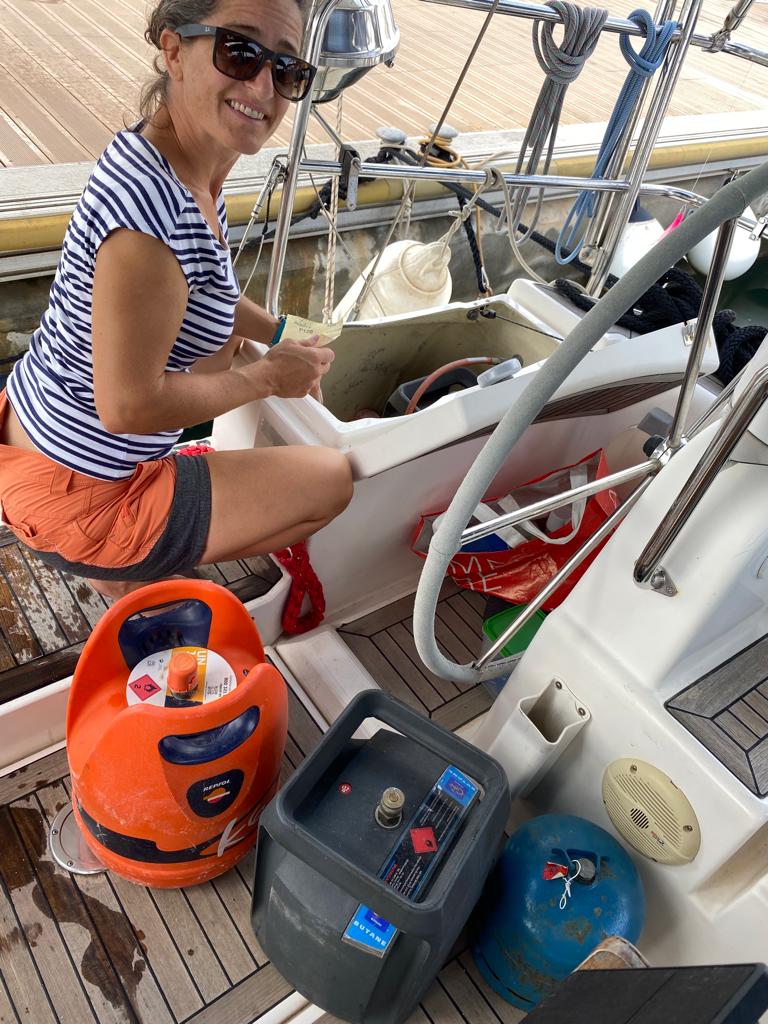 Le gaz à bord semble être toute une histoire… Chaque pays a sa propre connexion, ses propres types de bouteilles et rien n’est compatible! 😒 Alors pour éviter de se retrouver bec de gaz (c’est le cas de le dire 😂!), on a organisé différentes connexions et on devrait être tranquilles jusqu’aux Antilles. Heureusement que Papa a prévu plein d’outils avant de partir : Maman a dû agrandir l’ouverture du coffre où on range les bouteilles de gaz pour pouvoir ranger les bouteilles espagnoles (oranges) et il a fallu la petite disqueuse pour couper dans la fibre de verre.