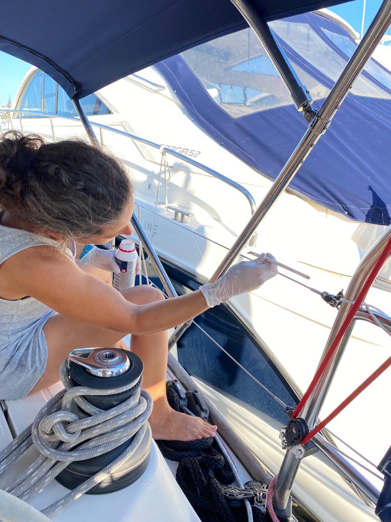 Depuis la tempête à Cabrera, le moteur ne fonctionnait plus très bien, il faisait que de caler tout seul, quelle que soit notre vitesse. C’était super stressant pour Papa pour faire l’amarrage dans le port, mais heureusement il ne s’est pas arrêté pendant la manœuvre! 😅 On a trouvé un réparateur qui a trouvé le problème. Pendant notre « looping », le réservoir de diesel a été fortement secoué, ce qui a décollé le chenit qui reste normalement au fond. Les saletés ont bouché le filtre, ce qui empêchait le moteur de recevoir correctement le diesel.
