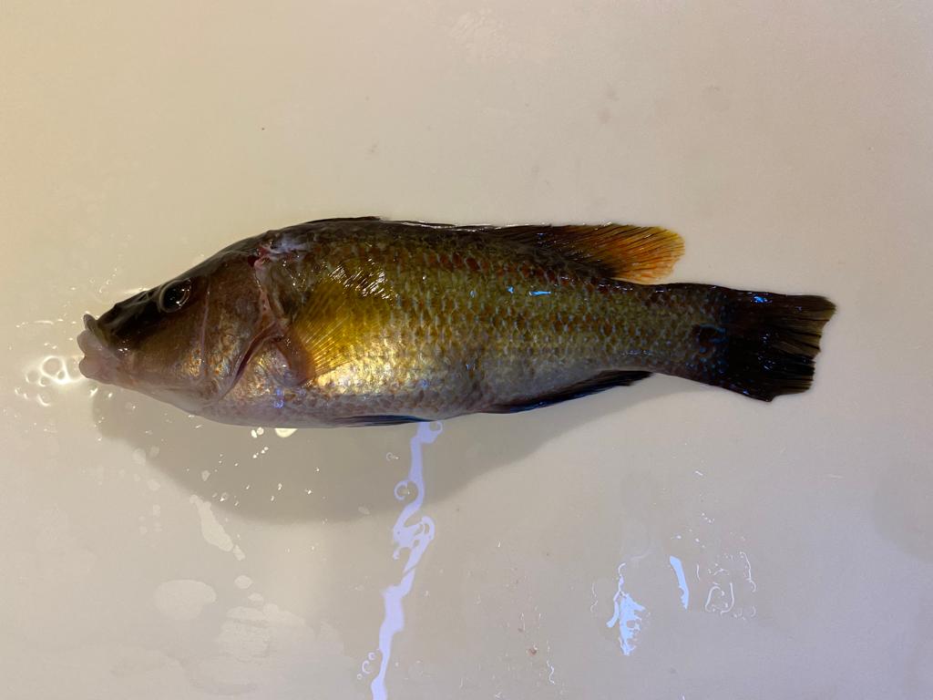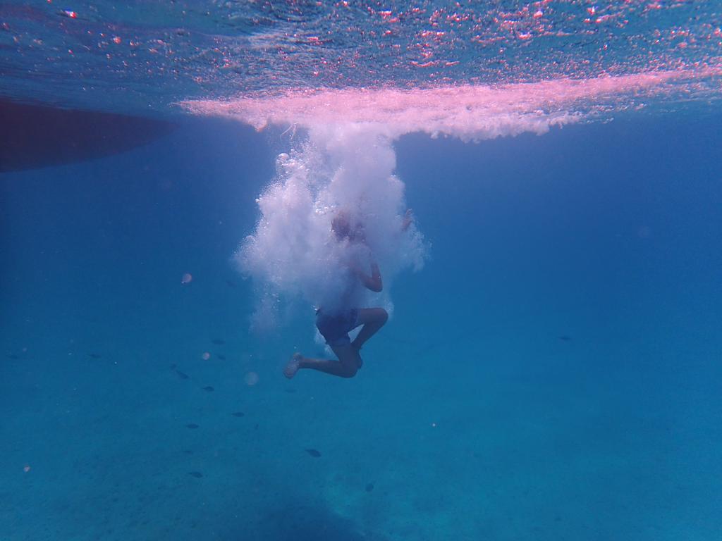 Et la croisière s’amuse a continué comme ça jusqu’à lundi, tout autour de l’île : navigation, baignade, snorkeling, pêche, bonnes bouffes, sauts depuis le bateau, jeux entre cousin-cousines, parties de jass, … Dimanche, Papa a passé des heures à chasser et il nous a ramené des nouveautés : Gilbert le corb, Gabrielle le rouget de roche et Gilou le Crènilabre paon. Heureusement qu’à l’Hôtel Black Pearl tout le monde aime le poisson 😅!