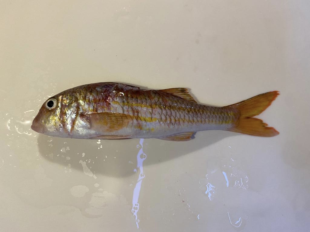 Le soir à Cala Sahona, il y avait plein de méduses mais ça n’a même pas fait peur à Papa le chasseur qui a harponné 4 poissons pour le souper : (de haut en bas sur la photo) Diana la saupe, David le sar à tête noire, Dominik la saupe et David le sar commun. Un festin! 😋