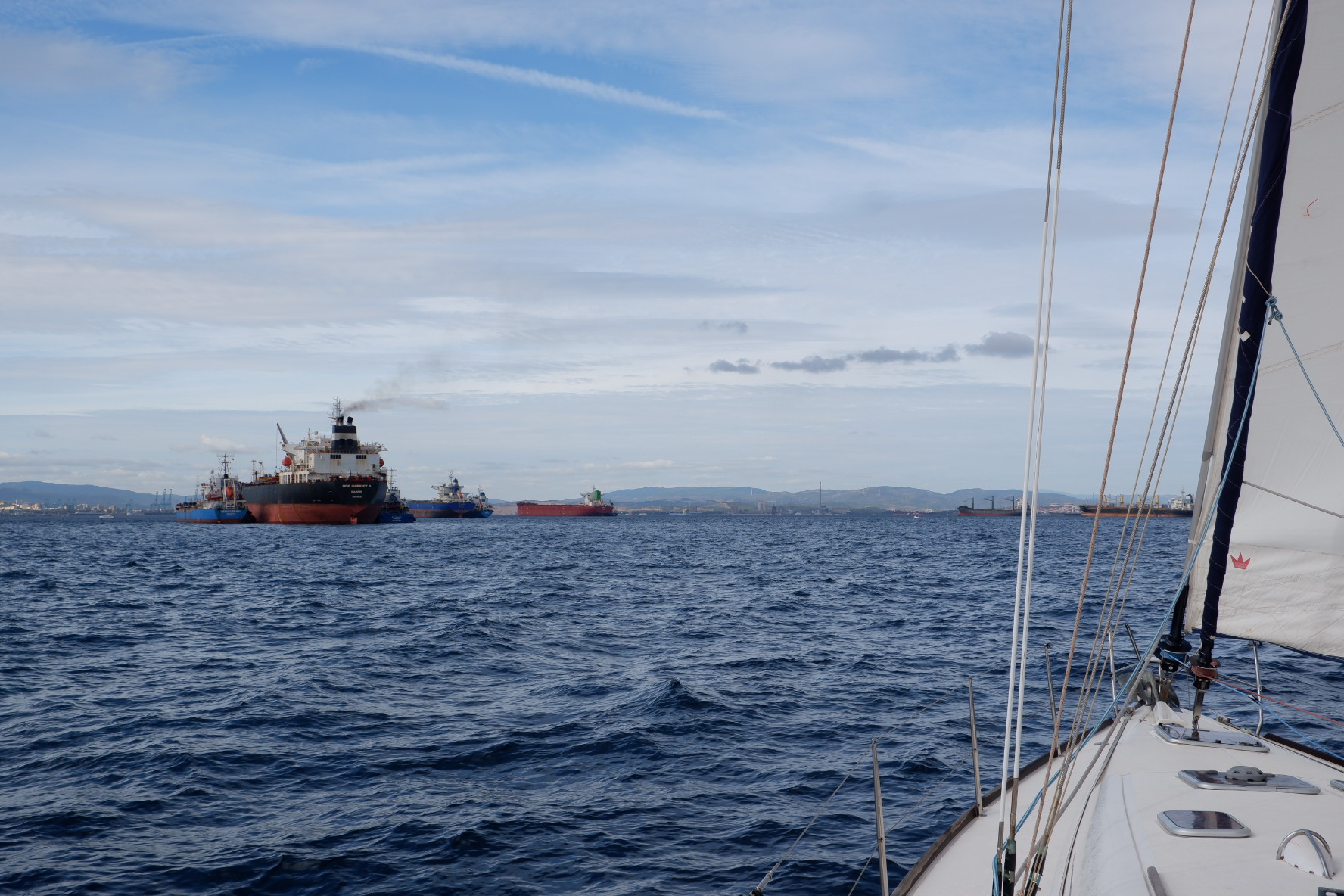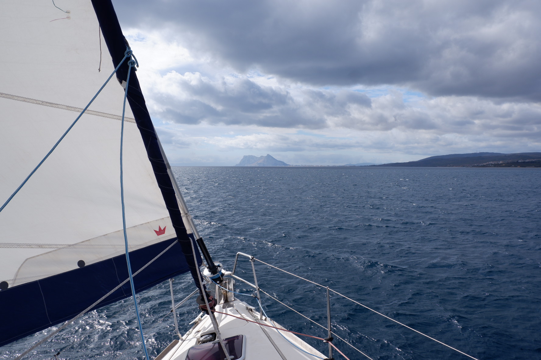 Comme on avait envie d’arriver de jour à Gibraltar, nous avons mis l’ancre à la plage de Sotogrande pendant la nuit de mercredi et nous sommes repartis jeudi matin avec le vent d’ouest, le « poniente ». Les conditions de navigation étaient top, un long bord de près jusqu’à Punta Europa, la pointe de la péninsule de Gibraltar. Tanguy a barré pendant une bonne partie du trajet, avec du vent qui dépassait 20 noeuds par moments, il a assuré 😎!