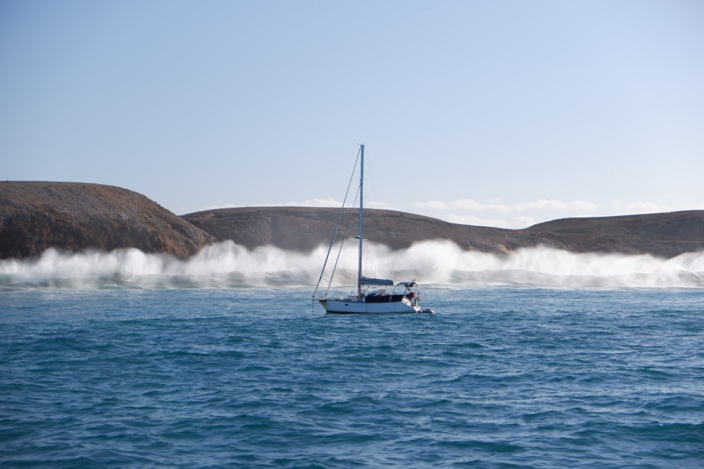 C’était seulement le début des grosses vagues. Le lendemain matin on se serait crus à Hawaï, les bateaux autour de nous disparaissaient dans les creux de la houle. C’était beau à voir mais on a dû chercher un endroit mieux abrité.