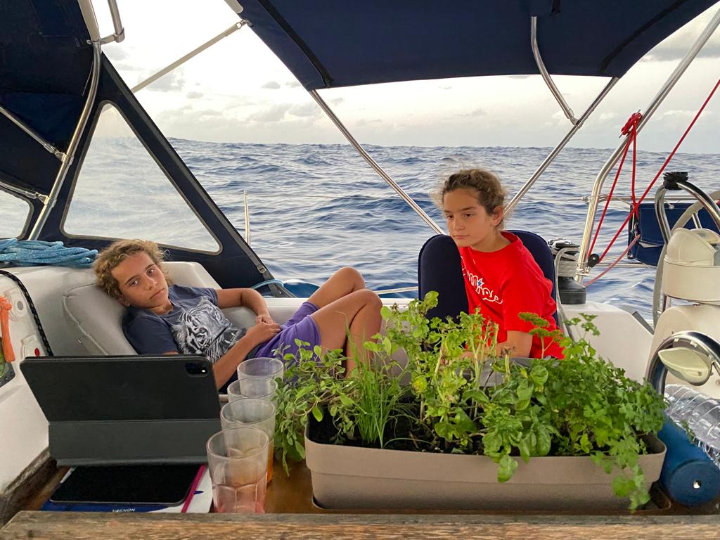 On a offert à Neptune le basilic grec qui n’a pas supporté la mousson à La Palma et ensuite la cuisson lente sous le roof 🥵. Maman a déplacé le bac de rucola pour qu’il ne subisse pas le même sort. Elle a fait un micmac avec de la garcette et du grey tape sur le pied de la table, ce qui ne plaît pas à Papa, mais ça a l’air de bien fonctionner et elle a promis de nettoyer la pedze 😂. Pendant la traversée, on a mangé deux belles salades de rucola du potager Black Pearl 🥬😋.