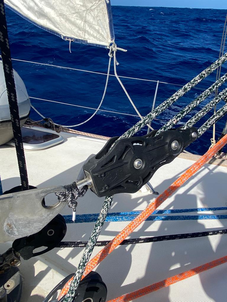 Un peu plus tard « bam!!!!! »💥 C’est la filière tribord qui a explosé 😵. ça fait plusieurs jours qu’on navigue bâbord amures et l’écoute de génois fouette violemment la filière quand les vagues le dégonflent et le regonflent. Papa repart sur le pont pour réparer ça avec du dyneema. On a sacrément de la chance d’avoir un Papa-capitaine qui sait tout faire!!! 🥰