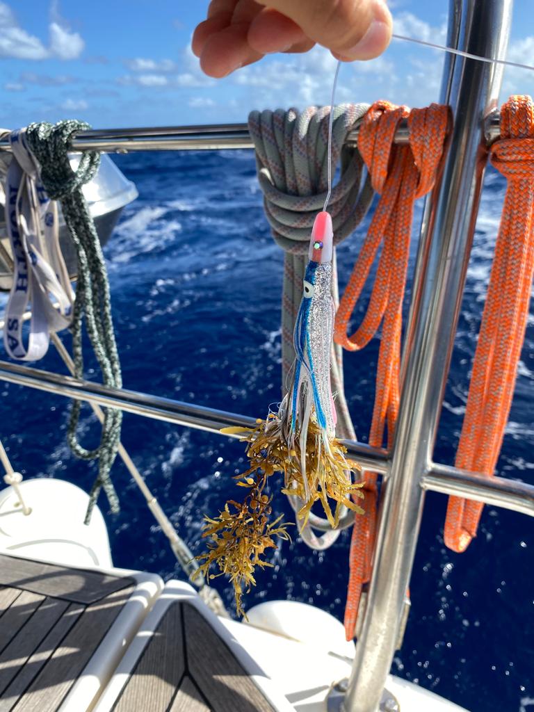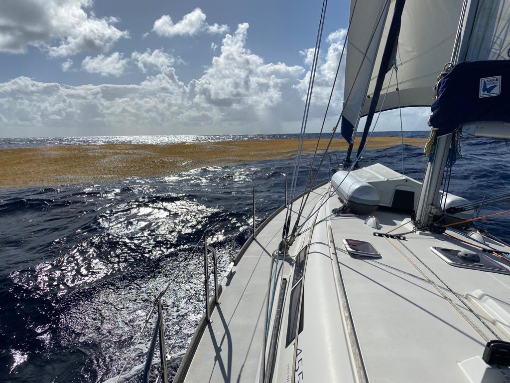 Toujours plus de sargasses, des fois aussi grandes qu’un terrain de tennis! On se demande si il y en a aussi tout autour de la quille et du safran… 🤔