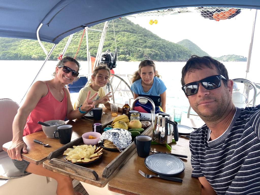 Papa était tout énervé ce matin parce que la contre-écoute était passée sous le bateau 😕. Impossible d’empanner dans ces conditions. Il a réussi à la récupérer en tirant dessus comme un fou. On a pu faire notre dernier empannage pour mettre le cap sur Sainte-Lucie! Plus que 100 miles… 50 miles… Moi je n’ai pas suivi l’arrivée, je préférais roupiller… je sais juste qu’ils ont mis l’ancre à 2h30 à Rodney Bay et j’ai découvert l’eau turquoise en me réveillant ce matin 🤩!