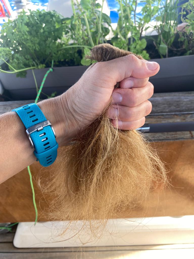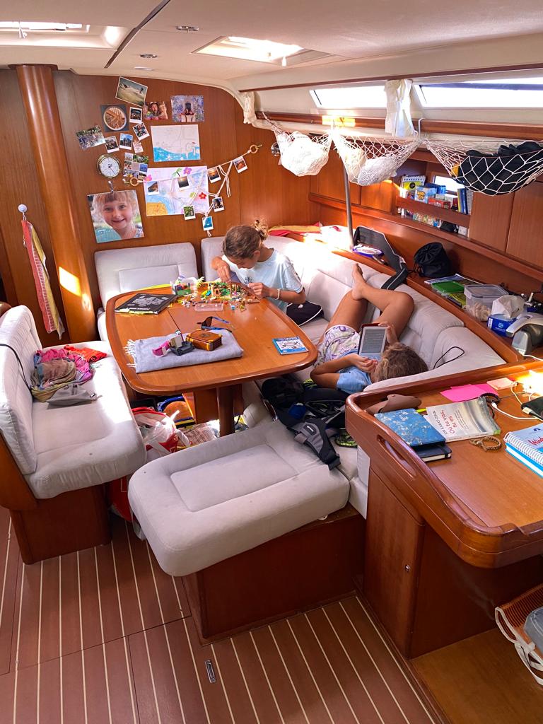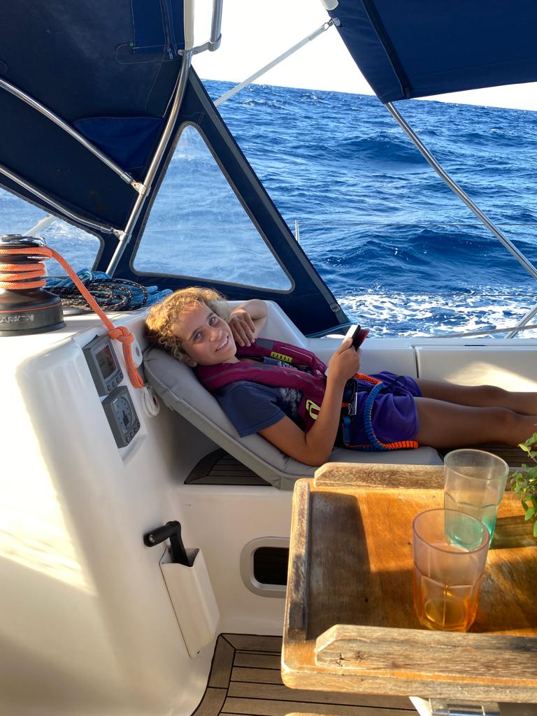 Fin d’après-midi c’est le salon de coiffure à bord. Tanguy et moi on s’est lavés, y compris les frizzzz. C’était la cata à démêler… 😰 j’étais déjà en mode rasta-Julie et Maman a brossé mèche par mèche avec des tonnes de crème démêlante 😭. A la fin elle m’a coupé une vingtaine de centimètres (oui, oui, sans déconner) et elle m’a fait une tresse plaquée pour que ça reste en ordre quelques jours🤞!