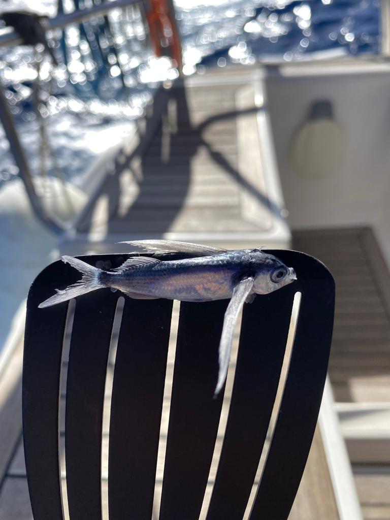 Depuis plusieurs jours, pendant la nuit, des poissons volants essaient de survoler le bateau. Certains y arrivent, d’autres échouent sur le pont. Certains arrive à sauter à l’eau… et d’autres agonisent rapidement et on les retrouve séchés le lendemain matin 😓🐟🏴☠️. Il y en a qui a sauté contre papa, sur son bonnet 🤪!