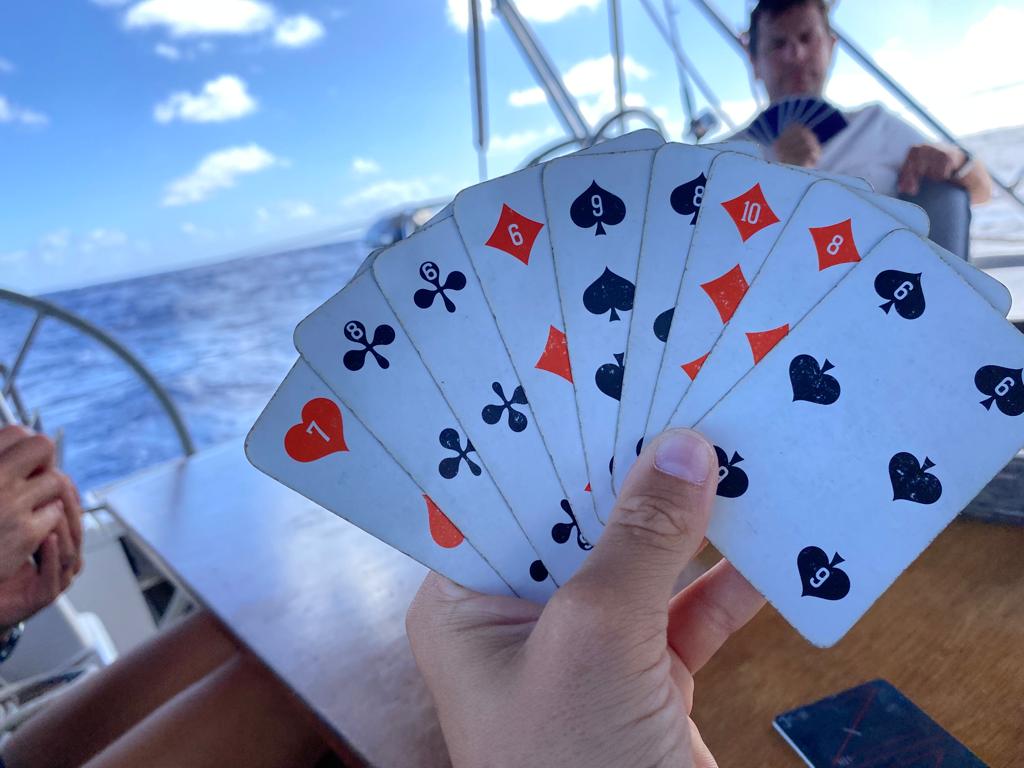 L’alizé a été parfait pendant tout le voyage, parfois un peu plus fort, parfois un peu plus mou. On a mis le moteur en tout et pour tout pendant 5 heures, quand le speedo n’affichait plus que 4 noeuds, parce qu’on ne supportait pas d’avancer si lentement après des jours à surfer à toute vitesse. 🏄♂️⛵️💨