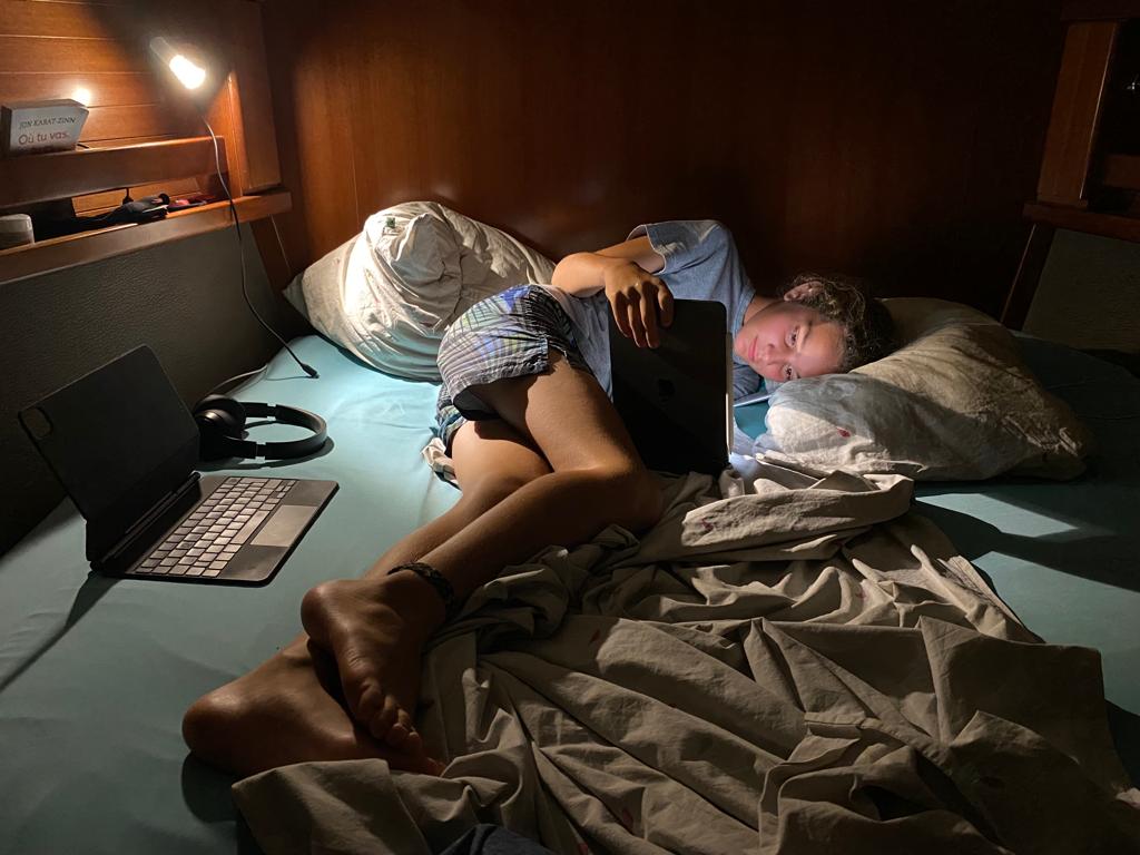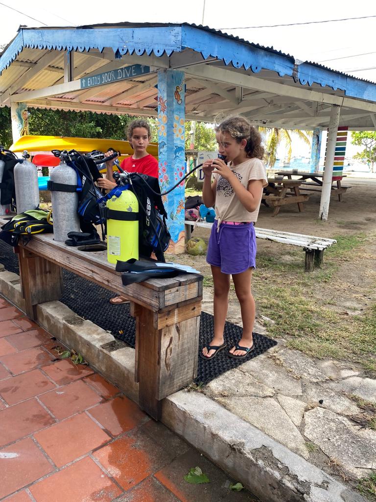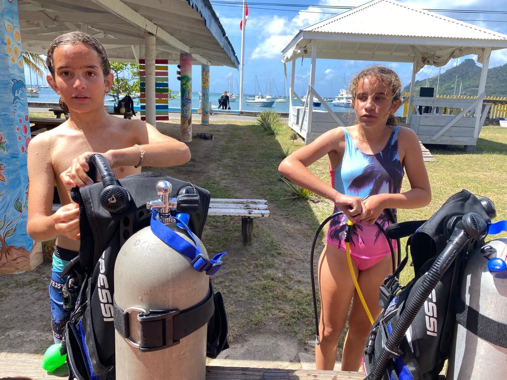 Vendredi matin, on a dû mettre un réveil pour être à 9h au club de plongée, Dive Carriacou. On a tout de suite commencé la pratique en préparant notre matériel et en allant plonger depuis la plage. Avec Tanguy, on a trop kiffé!! Murielle notre instructrice est hyper sympa, on a rigolé tout le temps 🤪🤿! Par contre la fin de la journée n’a pas été très drôle, on a dû apprendre deux chapitres du cours open water… on a fini à 21h… Maman s’est même endormie à côté de moi pendant que je travaillais 😂😴.
