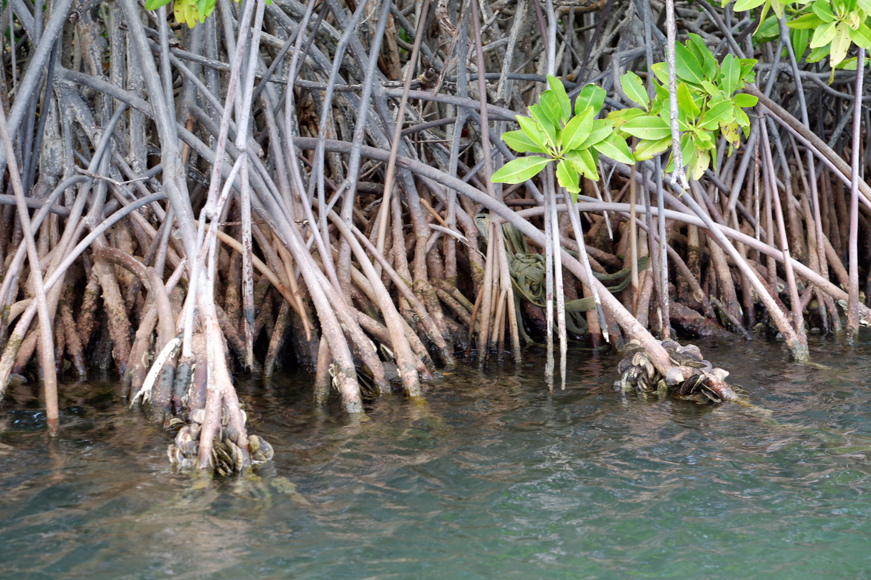 Dimanche, c’était jour de congé. On a pris le dinghy et on est allés faire un tour dans la mangrove. Il y a ici des sortes d’huîtres qui poussent sur les racines des palétuviers 😳… Il y a aussi des bateaux abandonnés, qui étaient sûrement venus là pour s’abriter d’un ouragan.