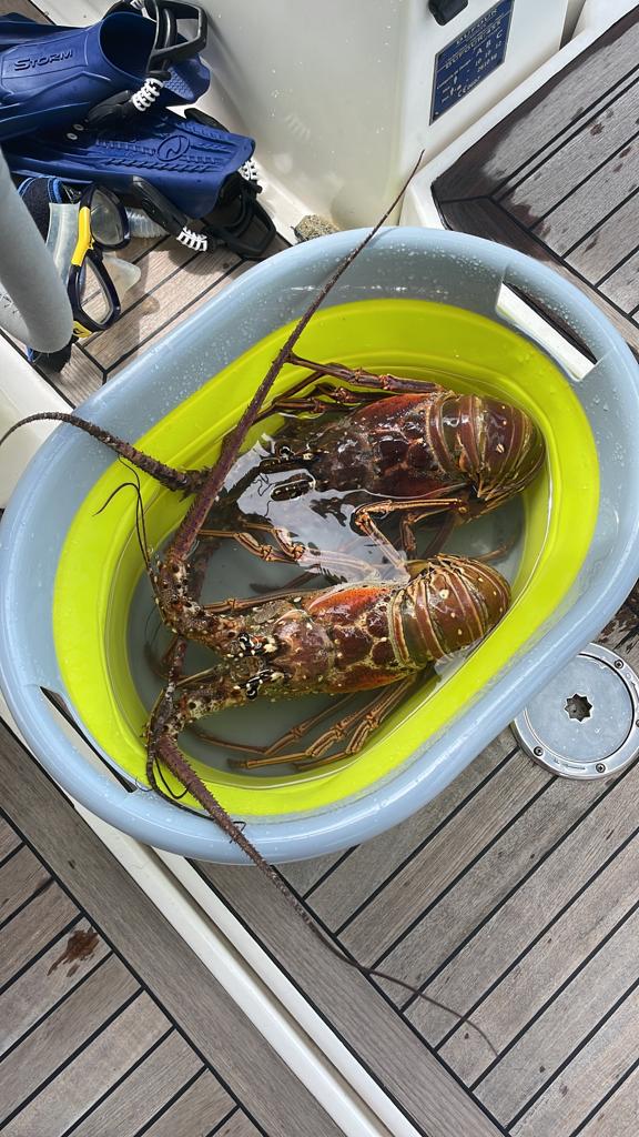 Samedi, on a fait notre deuxième jour de cours avec les plongées en milieu protégé, c’est-à-dire depuis la plage. On a fait plein d’exercices, vidage du masque, remorquage, échange de détendeurs, panne d’air, etc… on est restés une heure et demi dans l’eau, on était cuits!! 😅 Papa et Maman nous ont fait des immenses langoustes au grill pour le souper, ça nous a requinqués! 😋🦞