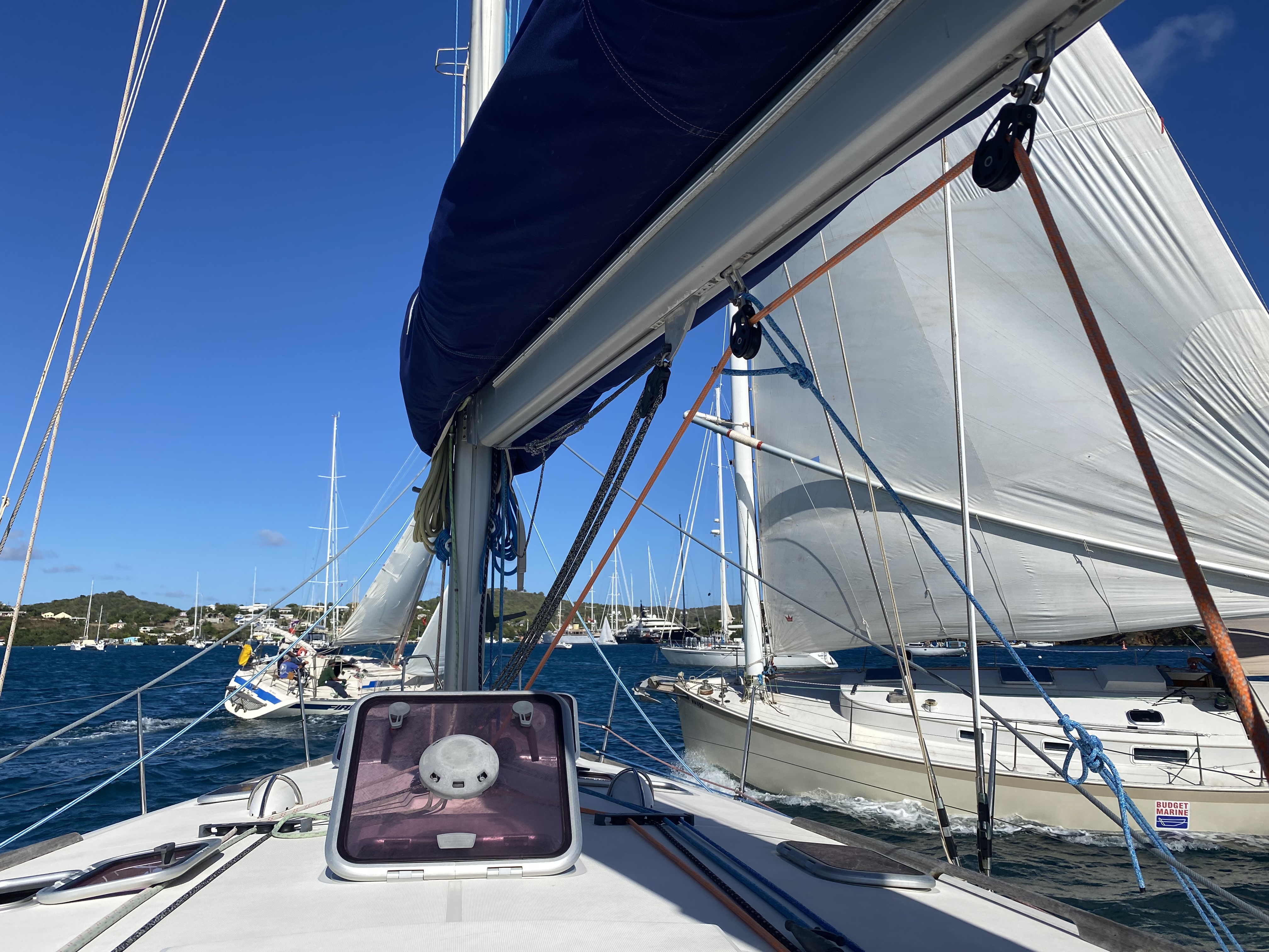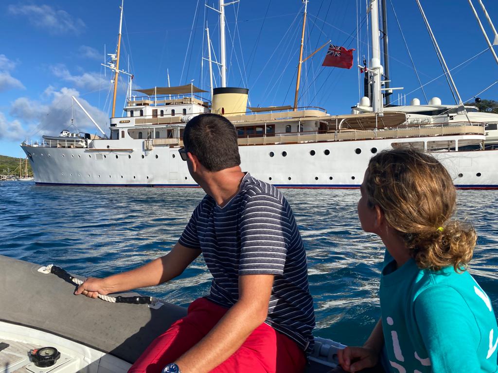 Après 7h de navigation, on est arrivés à Falmouth Harbour. Là-bas il y a une marina de super-yachts, alors pour nous qui étions à l’ancre dans la baie, il y avait du spectacle 🤑💴😅. En fin de journée, il y avait la «régate du soir» du club de voile local dans la baie… mais il faut vous imaginer que ce n’est pas aussi simple que dans la baie de Morges: il y a des bateaux partout au mouillage, plusieurs chenaux de navigation, des récifs de corail,… bref, un vrai champ de mine 😅! On a même eu de l’action avec un croisement entre deux bateaux qui s’est fait à notre étrave!